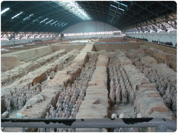 首先到的第一站便是秦始皇兵馬俑,當我們走進展廳時,一個個冷峻的武士,一件件古老的兵器,仿佛要立刻把我帶入那戰國時期秦王一掃六國的戰場一般,它們讓我們感受到秦國的戰爭與生活。大家驚嘆,這個氣勢太宏偉了,不得不佩服古代人民智慧和力量!人都說感受古文化須七分聽,三分看,我們圍在導游身邊聽她熟練的介紹,不知不覺的參觀了一號到四號坑,除了一號坑是已經出土兵馬俑外,其余的二個坑均未出土文物,有一個坑是空坑。聽說如果現代挖掘技術不能完全攻克,有生之年還看不到更精彩的出土文物,雖感到遺憾,但還是希望這些文物能夠完整保留,必竟是先人遺留下來的寶貴財富。